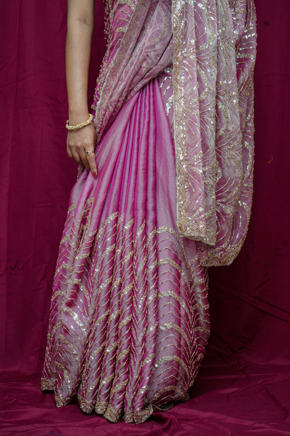 A delicate soft pink base that feels feminine, graceful, and universally flattering. The body is adorned with intricate golden zari and sequin embroidery in the same cascading chevron–leaf pattern, adding texture and luxury while maintaining the saree’s elegant subtlety.