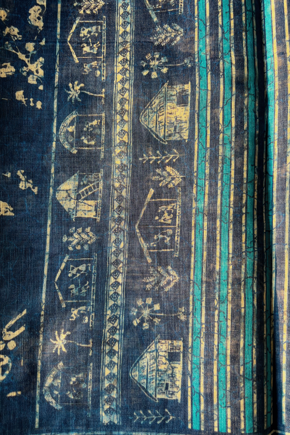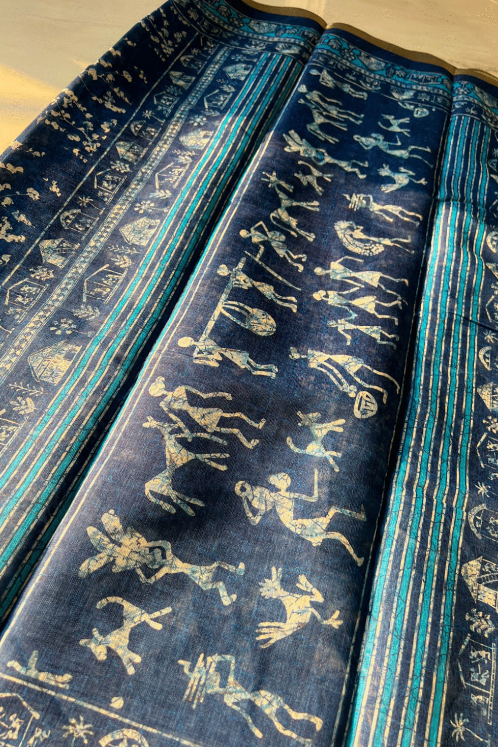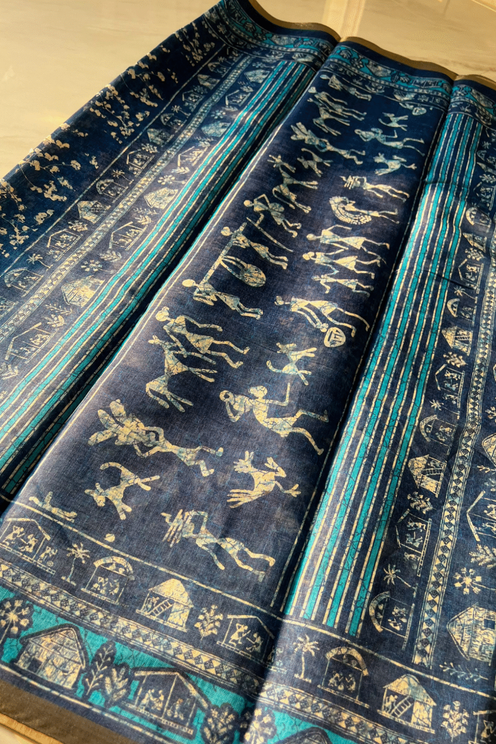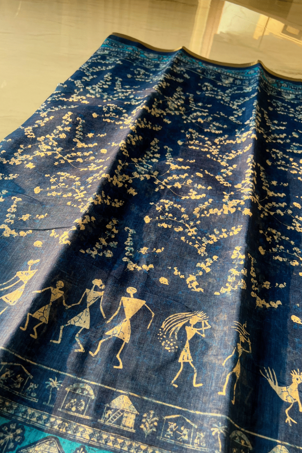 Indigo cotton adorned with delicate flower-like and Warli-inspired block motifs, with a detailed Jhal/block-printed pallu. Lightweight, breathable, and effortlessly elegant — perfect for festive or cultural occasions.