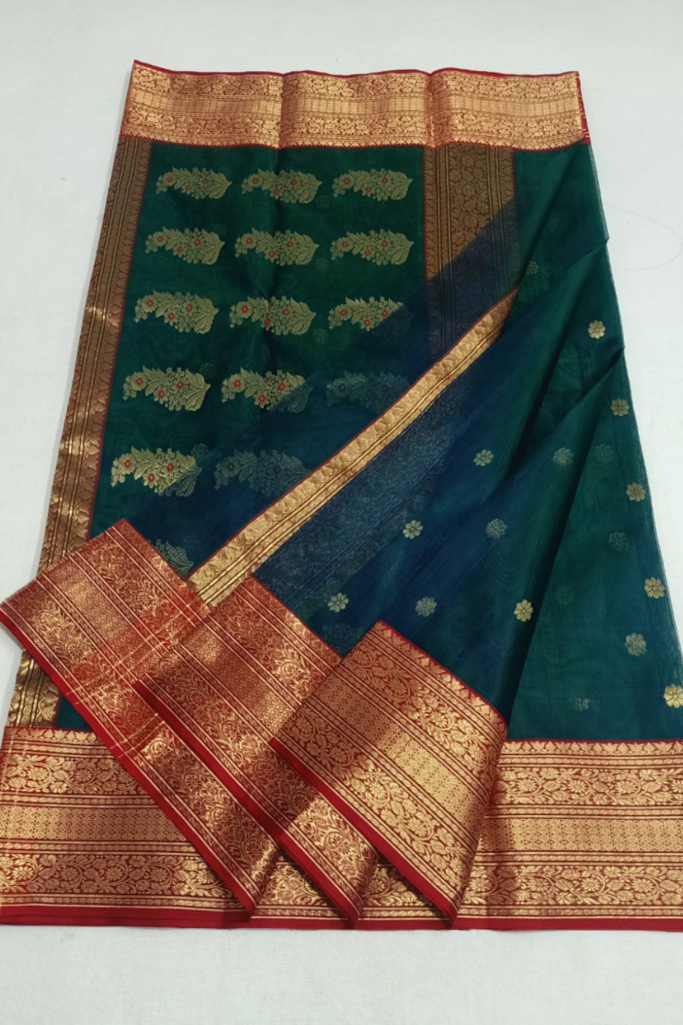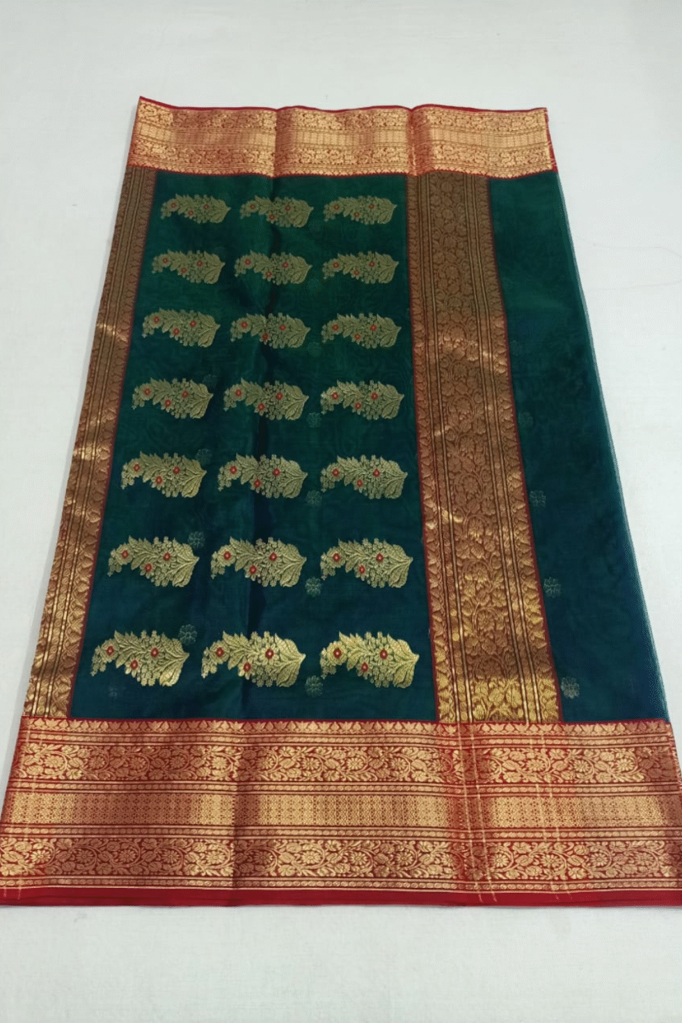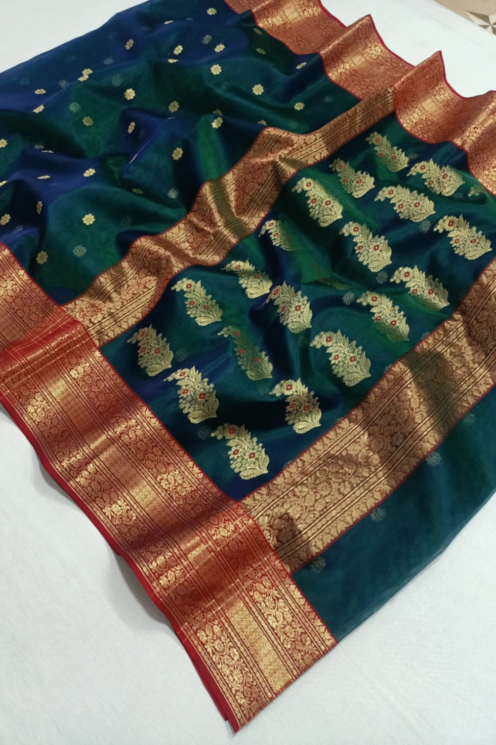 Comes with a matching maroon blouse material with zari detailing. You can also style it with a gold blouse for a brighter festive look or a contrasting deep blue for a contemporary touch.