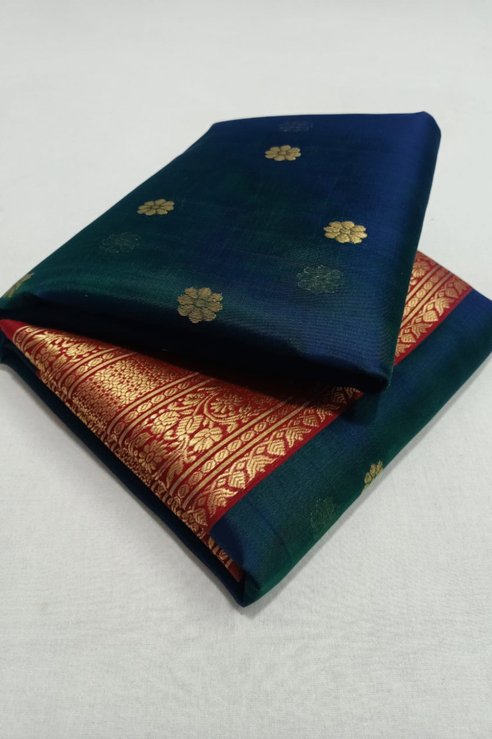 The saree blends traditional South Indian artistry with premium handwoven finesse. The golden zari designs across the body stand out elegantly on the blue base, while the maroon border enhances its richness. Together, they create a luxurious yet timeless aesthetic.