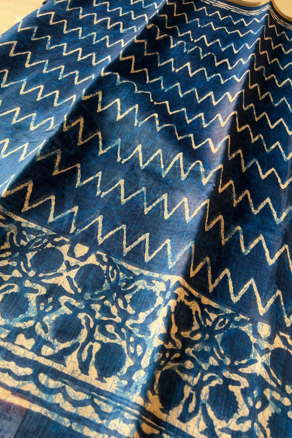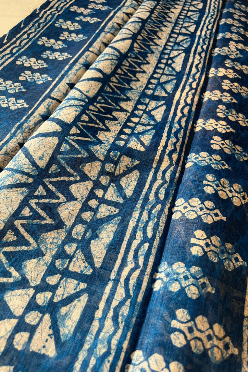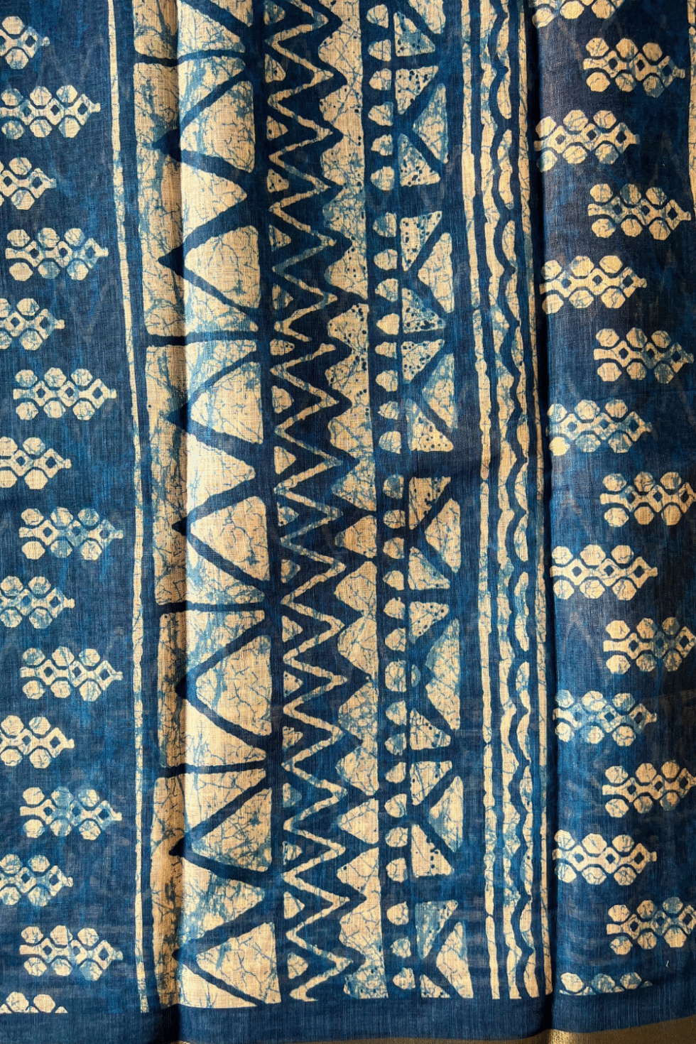 Indigo cotton adorned with bold zig-zag block prints, lightweight and breathable. Perfect for festive occasions, cultural gatherings, or casual celebrations — effortless elegance in every drape.